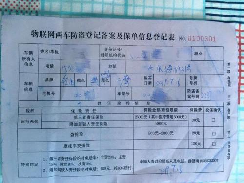 二,购买交强险(不买是不给上牌的),开始我以为交强险像汽车一样的,结果只买了190元,车船税用身份证填了个单子就免去了,比汽车便宜很多啊。