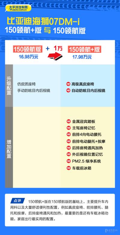 150领航+版相比150领航版价格贵了1万元,但是提升了大量舒适便利性配置。像前排座椅功能基本拉满,而且后排座椅也给你上了通风加热功能,无论是炎热还是寒冷前后排的待遇都是一视同仁。不到18万拥有如此高的配置表现,150领航+版是本次海狮07DM-i里最值得购买的车型。