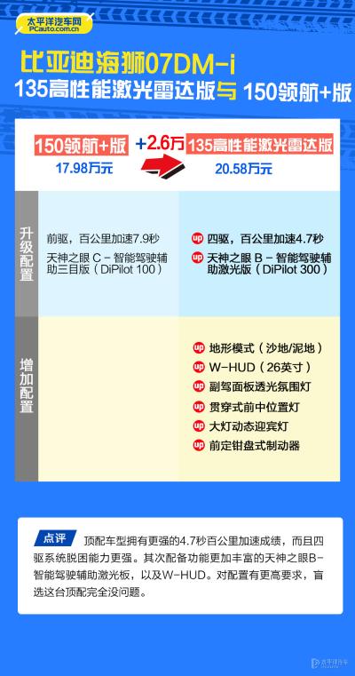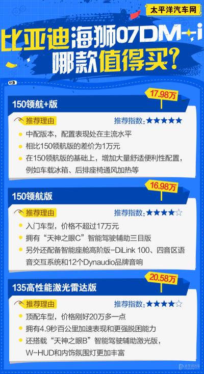 海狮07DM-i已经在近期正式上市,新车共推出三款车型,官方指导价格为16.98-20.58万元,全系车型支持选装灵鸢比亚迪智能车载无人机系统(价格为16968元)。那么这三款车型应该怎么选?接下来就为大家分析一下。