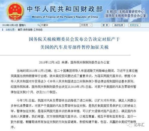 中国汽车新闻网讯12月14日,财政部发布《国务院关税税则委员会关于对原产于美国的汽车及零部件暂停加征关税的公告》,国务院关税税则委员会决定从2019年1月1日起,对原产于美国的汽车及零部件暂停加征关税3个月,涉及211个税目。