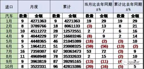 自2018年5月份以来,中国进口车及零部件关税调整波动明显。根据此前乘联会公布的2018年进口车销量显示,1-10月,中国汽车进口96万台增-5%,其中10月进口8万台,进口量同比增-20%,环比9月的9万台下降较多。2018年1-10月,中国汽车进口428亿美元增5%,其中10月进口35亿美元,同比增-20%,环比9月的39.6亿美元下降10%。