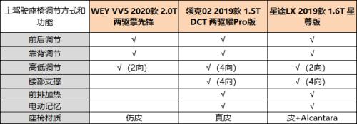 相比尺寸大小这个问题,紧凑级SUV的乘坐舒适性才更能体现出高级感,也是消费者比较受关注的点。三款车的主驾座椅都有着丰富的调节方式,其中领克02和星途LX更是拥有4向腰部支撑、前排座椅加热和电动记忆功能。而材质上,采用Alcantara和皮质混搭的星途LX则更胜一筹。