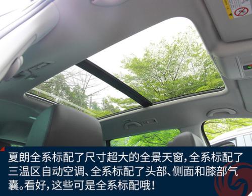 在配置方面,夏朗6座版也确实有值得称道的地方,比如夏朗全系标配了尺寸超大的全景天窗,全系标配了三温区自动空调、全系标配了头部、侧面和膝部气囊。看好,这些可是全系标配哦!