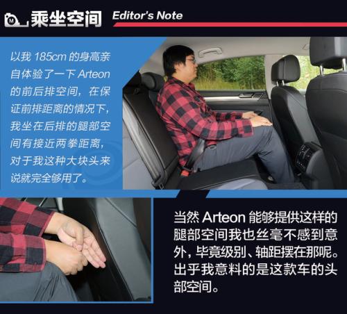 而且流线造型并没有影响到Arteon的车内乘坐空间,以我185cm的身高亲自体验了一下Arteon的前后排空间,在保证前排距离的情况下,我坐在后排的腿部空间有接近两拳距离,对于我这种大块头来说就完全能够松松快快的坐在后排了。