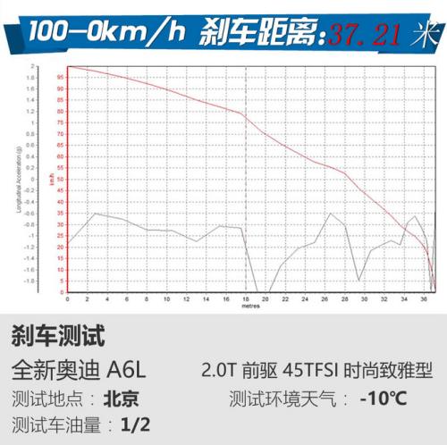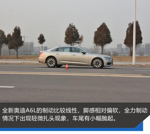 全新奥迪A6L的制动比较线性,脚感相对偏软,经过我们10余次的反复测试,刹车并没有出现热衰减的现象,成绩始终维持在37-40米之间,而最好成绩定格在37.21米,表现中规中矩。全力制动情况下出现轻微扎头现象,车尾有小幅抛起。
