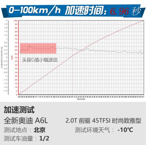 经过了一天关于引擎、悬挂、转向的体验,那么全新奥迪A6L的加速表现到底怎么样呢?实际测试时气温在-10°左右,相对较冷的天气里我们对车辆进行了预热将更有利于引擎的发挥。根据多次实际测试的数据来看,新车0-100km/h加速时间为6.96秒。
