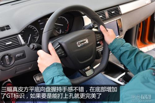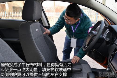无论设计还是材质与现款的观致3车型基本保持一致,T型内饰风格加上银色饰板运动味十足,同时在内饰的部分增加了一些“GT”标识,两款车型都采用了织物座椅(牛仔布)材质,相比皮质座椅看上去更年轻,大大的“GT” LOGO在打开门的时候很容易就可以看到。
