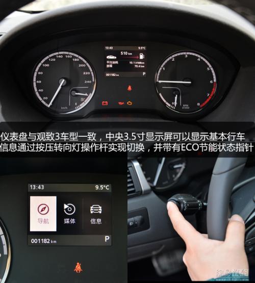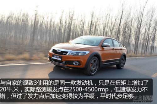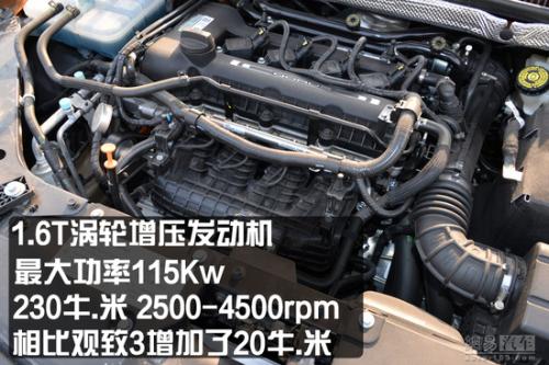 本次试驾的车型为1.6T自动致悦型搭配1.6T高效涡轮增压发动机,配6速QorosTroniqTM手自一体双离合变速箱,最大功率115kW最大扭矩230N·m参数与观致3保持一致,但相比观致3增加了20牛.米的扭矩,0-100公里加速9.7秒(手动挡)。