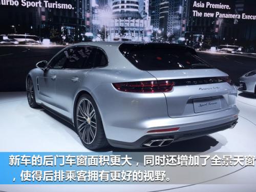 Panamera Sport Turismo基于保时捷Sport Turismo概念车进行打造,其前脸与Panamera保持一致,从后排车门的B柱开始拥有了独特的设计:在侧翼上方,细长的车窗线和同样长度的车顶轮廓突显了新车型的醒目外观。新车的后门车窗面积更大,同时还增加了全景天窗,使得后排乘客拥有更好的视野。