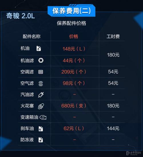而从配件价格表中我们可以看到,奇骏的工时费相比RAV4荣放会更便宜。重要的是,在汽油滤和变速箱油上有绝对优势,没有具体的配件价格和工时费,能为车主节省掉部分费用。