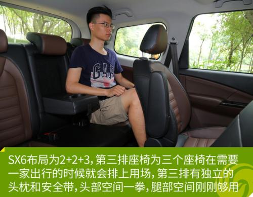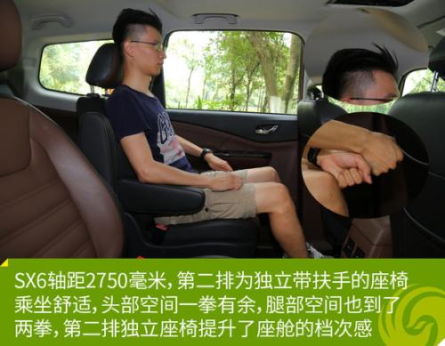 风行SX6基于S500轿车平台打造风行SX6的长宽高分别为4660*1810*1770(含行李架为1790mm),轴距为2750mm。与竞品相比,风行SX6在空间上拥有不小的优势,第二排为两个独立的座椅,舒适性和空间1都不错,在满足第二排乘客的舒适性下,第三排头部空间一拳,腿部空间刚好顶到第二排座椅椅背,如果牺牲第二排一点空间,第三排也能得到不错的空间体验。