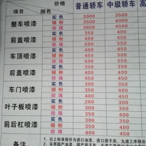 汽车喷漆或局部补漆的价格通常是包工包料,外观完全恢复到以前状态;对于面积大的可能需要出喷漆材料的费用,以下做个简单通俗的计算方法,请大家参考。