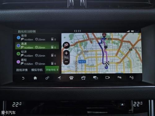 捷豹XFL的内置导航系统非常好用,当输入目的地时,系统会提供多种路线规划,分别为推荐、高速、经济、最短四种选项,可根据实时路况选择相应路线。(实时路况需要插入SIM卡或通过连接手机热点实现)