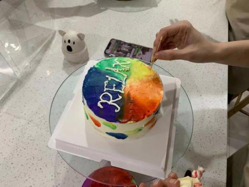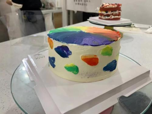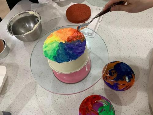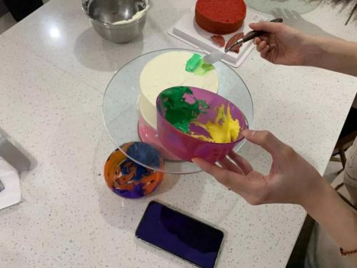 然后,就是把调制的食用色素勾兑奶油。按照最早那个模板给蛋糕上色。