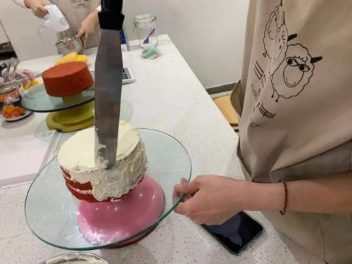 一个奶油蛋糕要从蛋糕坯子做起。红丝绒的蛋糕芯儿需要先修剪,让它更加圆。