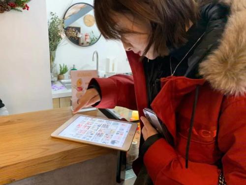 小姐姐选择了一个很有魔幻色彩的蛋糕原型,店员提示这个原型可能食用色素用的多。导致吃完了舌头变色,但是小姐姐还是坚持选择了这个蛋糕,就是ipad左下角的这款。