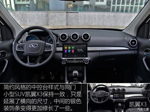 内饰方面,凯翼V3采用大面积黑色进行搭配,风格仍以年轻时尚为主。线条搭配干净利落,给人一种较为明快的感觉。三辐式方向盘样式较为新颖,10.1英寸的触控电容屏十分抢眼。中控台上的三个圆形的空调出风口,对整车的档次感和科技感有一定程度的提升。