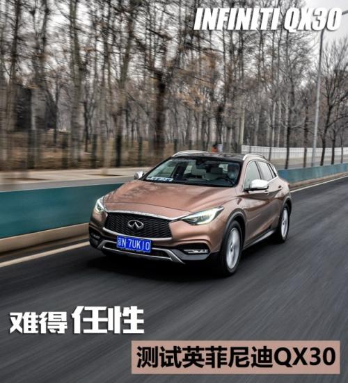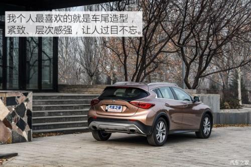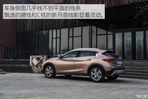 OK,说了这么多也该说一下今天要测的车了,英菲尼迪QX30,咱们先来看一下这辆车的身世。QX30来自日产位于英国桑德兰的工厂,是Q30抬高底盘而来的一款SUV,Q30又是出自奔驰MFA平台,和奔驰A级一样,而奔驰A级抬高底盘之后的产物是奔驰GLA,所以一句话概括,英菲尼迪QX30是奔驰GLA出生于英国的日本表弟,明白了吧。