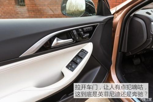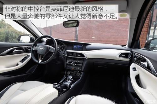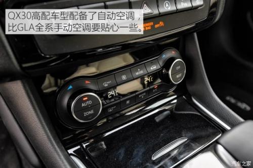 打开车门,有种被泼了一盆冷水的感觉,要是挡住方向盘上的车标说这是一台奔驰的话完全有人相信。固然QX30有着现今英菲尼迪标志性的不对称中控台设计、车内使用了大量皮革和软质材料、多媒体系统的界面和按键也是自家的。但是车钥匙、方向盘、仪表盘、空调按键、座椅调节、车窗控制这些最常用的东西都照搬自奔驰。同平台车型使用相同的零部件可以节省成本,这些我们都理解,你看科雷傲就和奇骏有相同的地方,但不像QX30用了这么多。而且这些出现在豪华品牌上,让人感觉怪怪的。