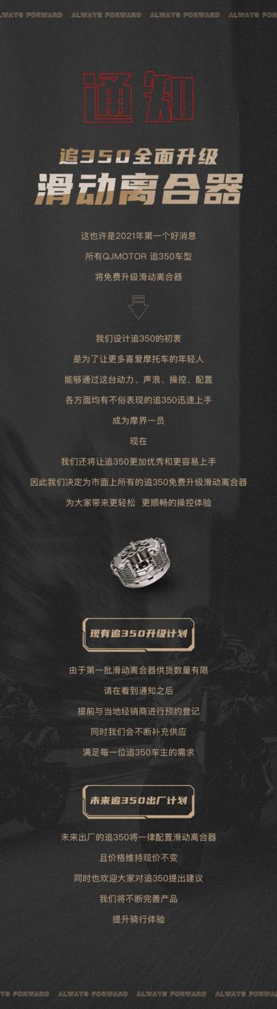 昨天QJMOTOR官宣将为已经上市的追350免费升级加装滑动离合器的消息。