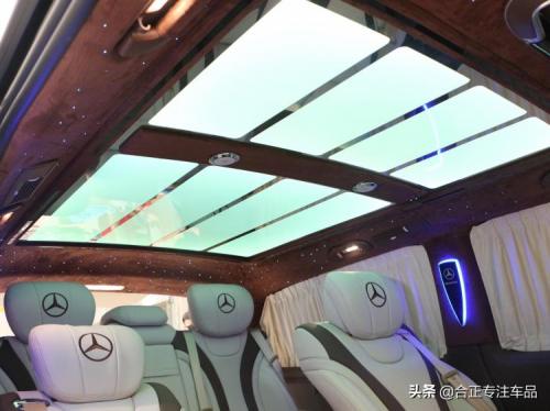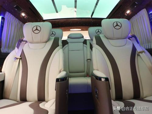 中排的座椅选用的是迈巴赫航空座椅,带电动腿拖、可调节通风加热和按摩功能及360度旋转。翻毛皮顶篷九宫格顶灯星空顶,格调沉稳大方,时尚大气,带来不同凡响的感官体验。