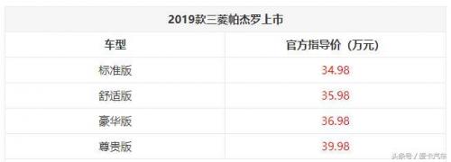 2018年7月1日,2019款三菱帕杰罗正式上市,售价区间为34.98-39.98万元。作为年度改款车型,新车在外观、动力方面与现款车型保持一致,新车主要根据配置方面进行升级。而相较老款车型,新车虽然配置上进行了升级,价格却进行了下调,最高降幅达到了3万元。