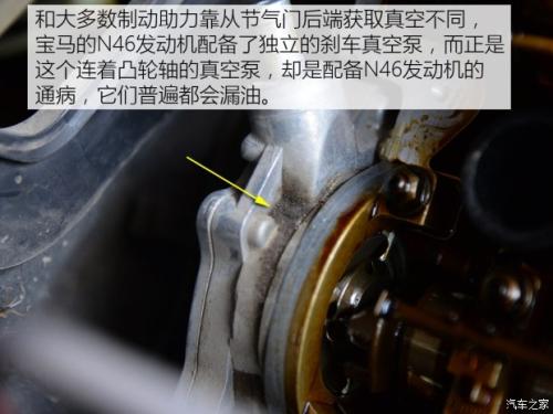 大多数车辆的刹车真空泵都是靠节气门后端获取真空的,因为N46发动机带有可变气门升程技术,节气门常开,传统的刹车助力泵无法从进气管获得足够的真空,所以宝马为配备了N46发动机的独立的刹车真空泵,虽然解决了低温下刹车不给力的问题,但真空泵漏油却是N46这一代发动机普遍存在的情况。