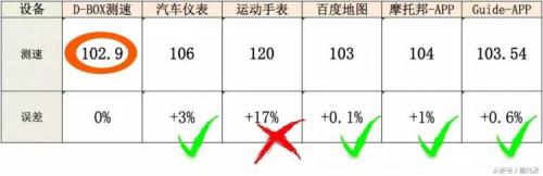 方式:测速车辆正常行驶,记录车辆速度表最高数值,然后通过D-Box的最高速测值分别比对包括仪表在内的各项测速工具的最高速度数值,再进行对比评估。