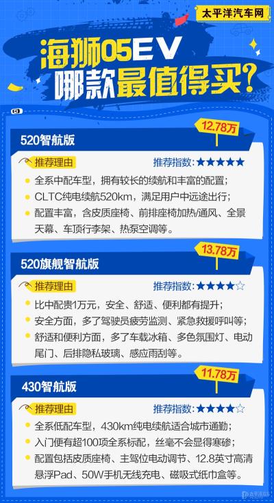 海狮05EV只提供三个版本车型,差价梯度都是一万元整,所以消费者选起来其实很简单,就看这一万元所带来的东西值不值。在上述分析中,12.78万的520智航版(中配)取得了续航、配置和价格上的最佳平衡,所以值得大部分意向消费者选购。