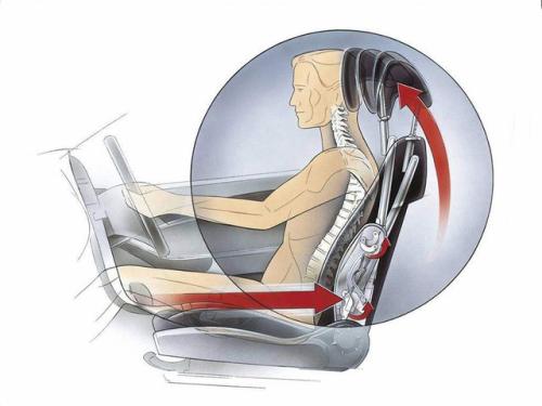 当乘客的重量作用在座位上时,防护装置便随之启动。碰撞发生时,头枕便会自动向前、向上移动;在追尾事故中,座椅靠背感受到乘坐人员向后的力,随即触发反应机构,使头枕自动向前、向上移动保护头部。