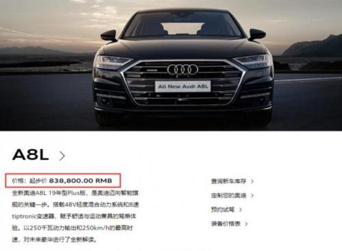 2020年在售的奥迪A8要多少钱?国内在售的奥迪A8L指导价是83.88万元起(店内成交有多大幅度的优惠这个另说),在美国,2020年款奥迪A8的起价为85,200美元。