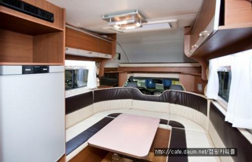 车内是比较现代的风格,驾驶舱顶部的睡卧区可以容纳两名成年人。虽然驾驶舱与后部车厢是连通的,但由于采用了环绕式沙发的布局,所以并不便于直接同行,但至少可以保证前后乘客的沟通交流。这套环绕式沙发和餐桌通过可以变成一张大尺寸的床位,可以满足人多时候的需求。