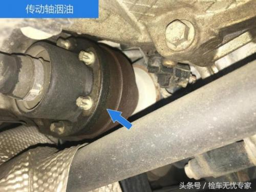 真是不经夸,刚说完干净就找到问题点了!传动轴位置有洇油现象存在,但是看起来并不严重。暂时不会影响车辆的正常使用(此现象多为密封老化所致)。