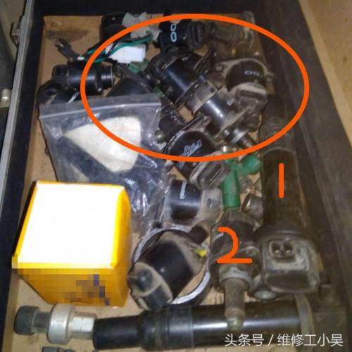 没想到,汽修师傅一下就抱出了一盒怠速电机!如下图所示,足足有十多个,1是表示点火线圈,2就是怠速电机。据汽修师傅介绍,这是他在拆车市场收集的怠速电机,和车一起报废就太可惜了,就拆了一些能用的怠速电机备用。