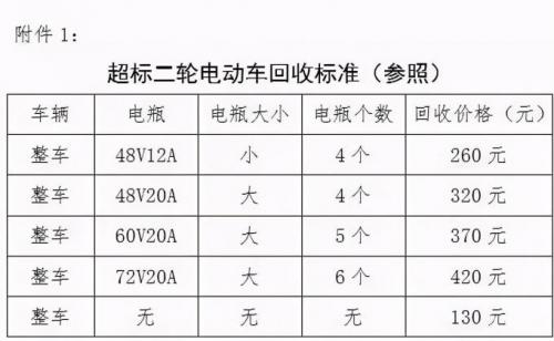 回收价在130元到420元不等,主要是根据电动车电瓶的数量来定价,电动车电瓶越多,补偿价格越高,最高的72V20A时电动车可以补偿420元。