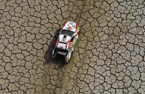 2018年1月8日,秘鲁,2018达喀尔拉力赛第3赛段,玻利维亚车手驾驶汽车穿越龟裂之地。