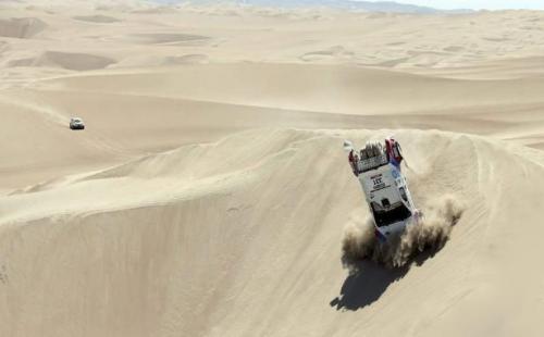 2018年1月7日,秘鲁,2018达喀尔拉力赛第2赛段,选手驾驶越野汽车翻越沙丘,车轮飞转沙尘飞扬。
