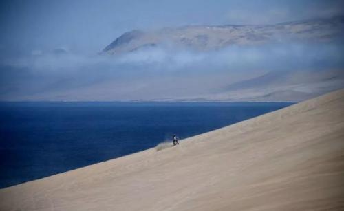 2018年1月8日,秘鲁,2018达喀尔拉力赛第3赛段,摩托车手穿越南太平洋海岸。