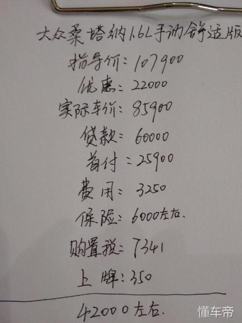 大众桑塔纳1.6L的手动舒适版的指导是107900元,笔者通过走访我们当地的大众4s店了解到,目前新款的桑塔纳优惠幅度在22000元左,也就是说这款车的实际车价是85900元以上,是我按照首付比例30%进行计算的,全部落地,包括购置税,上牌等费用,大概是在42000元左右。贷款金额6万元,如果分三年还清的话,按照正常的商业利息计算,每个月大概要还1800元左右。