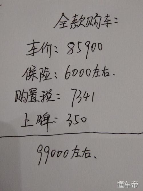 如果是全款买车的话,那么相对来说就会简单一些。从上图,大家可以看到全款买车的费用,主要是有车子的价格,购置税,保险,上牌等组成的,全部落地,大概是在99000元左右。和贷款买车相比,全款买车是不需要交手续费和贷款所产生的利息的。如果大家有足够资金预算的话,全款买车还是比较划算的。