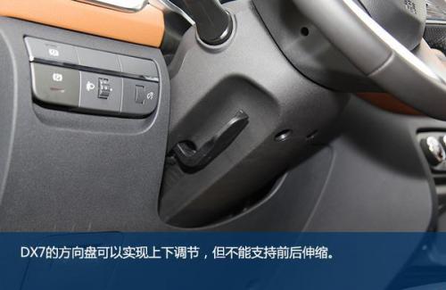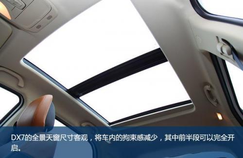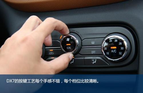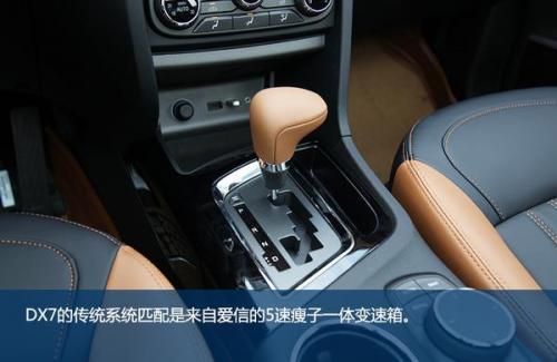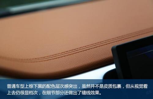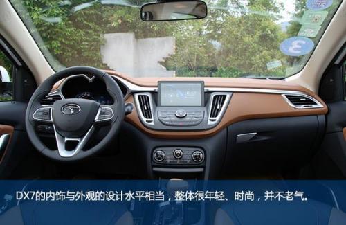 DX7的内饰与外观的设计水平相当,整体很年轻、时尚。普通车型上棕下黑的配色层次感突出,虽然并不是皮质包裹,但从视觉看上去仍很显档次,在细节部分还做出了缝线效果。在北京车展上市的黑爵饰版与普通车型的最大不同也正是体现在车内,新车是全黑内饰配色,并且在细节之处加入红色缝线元素,更具运动气质。
