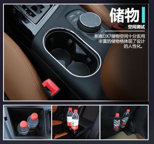在保证新款东南DX7应该拥有宽敞舒适乘坐空间的同时,该车巧妙的空间布局,为乘客提供了众多储物空间。在常规位置的杯架尺寸适中,能够容纳两瓶矿泉水。中央扶手箱尺寸一般,并不能过多的放置大件物品,放置两瓶矿泉水倒是毫无压力。在后排中央扶手处同样设置了水杯架,深度并不高,但也算一项较为实用的配置。