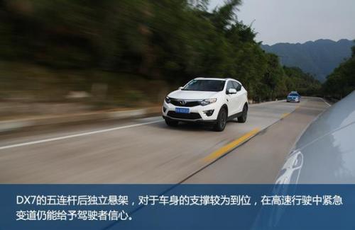 在发动机转速拉高以后,该款发动机的动力表现就显得可圈可点了,将油门继续深踩,速度提升迅猛,有着十分明显的推背感。值得一提的是,DX7的五连杆后独立悬架,对于车身的支撑较为到位,在高速行驶中紧急变道仍能给予驾驶者信心。同时,东南DX7在NVH方面所下的功夫能够直接在驾驶过程中体现出来,行驶过程中车内的一直处于舒适范围内,即使车速超过120公里每小时,传入车内的噪音也不恼人。
