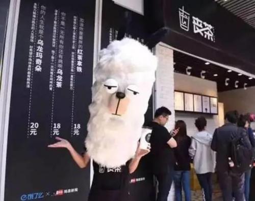 除了选择黑色为主色调,丧茶的代言人选择了“微博网红”王三三,一个以羊驼为基础的动漫形象。
