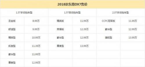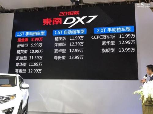 8月25日,成都车展开幕首日,东南2018款DX7正式上市。新车售价为8.99-13.99万,共有1.5T以及2.0T两种动力可选,共推13款车型。作为年度改款车型,2018款DX7在外观以及动力上的改动不大,主要针对内饰以及配置进行升级。新增的1.5T手动足金版售价为8.99万,进一步拉低车系的售价区间。
