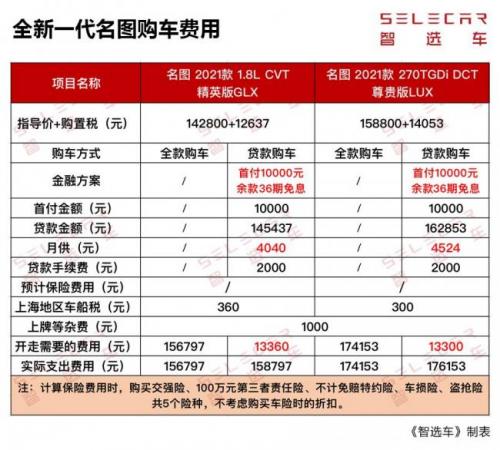 通过全文概要,想必大家对全新一代名图购车、养车的信息已经有了基本了解。由于该车提供了两套动力系统,所以小智就基于不同的动力系统选择了主销配置,分别是售价14.28万元的【名图2021款1.8L CVT精英版GLX】和售价15.88万元的【名图2021款270TGDi DCT尊贵版LUX】。