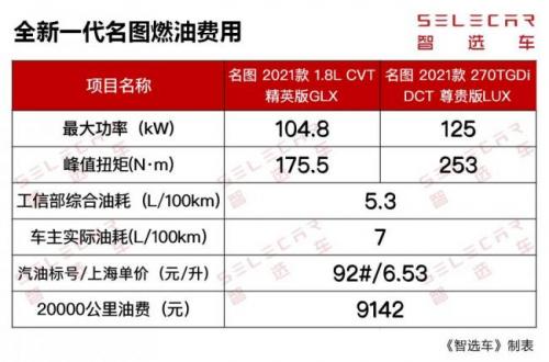 按照上海92#汽油6.53元/升,一年行驶20000公里计算,全新一代名图两款动力车型的一年油费为9142元。