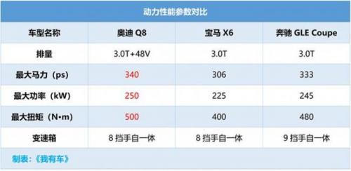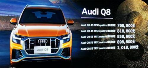 《我有车》原创新车报道:2019年10月25日,奥迪全新旗舰级中大型SUV——奥迪Q8正式上市,除先期推出的288辆限量版外,共推出两款2.0T和三款3.0T的5款配置车型,官方指导价76.88~101.88万元。其中,3.0T V6涡轮增压发动机的最大功率340马力(250kW)的,峰值扭矩500牛-米,并提供48V轻混系统。此外,新车全系标配了8AT手自一体变速箱和quattro全时四驱系统,百公里最快加速仅6.2秒。