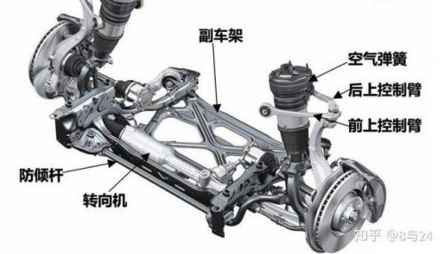 空气悬架准确的讲应该为搭载了空气弹簧的悬架系统,简称空气悬架系统,换句话说,任何的悬架形式只要将原有的钢制弹簧替换成空气弹簧(除此之外还需要加装传感器、气泵、气阀、储气罐、控制器及气路等),都可以称之为空气悬架,目前乘用车上最常用的前空气悬架结构为双叉臂结构,最常用的后空气悬架结构为多连杆结构,可参考下图。