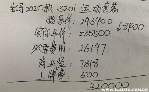 宝马2020款320i运动套装官方指导价29.39万元,加上现阶段2.06万元的降价优惠,实际车价也就是27.33万元,全款购车包括车辆购置税(23777)、交强险(950)、车船税(480)、商业险(6946)、上牌费(500)以及其它手续费(1000),最后这2020款宝马3系落地30.55万元。